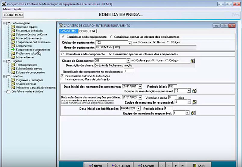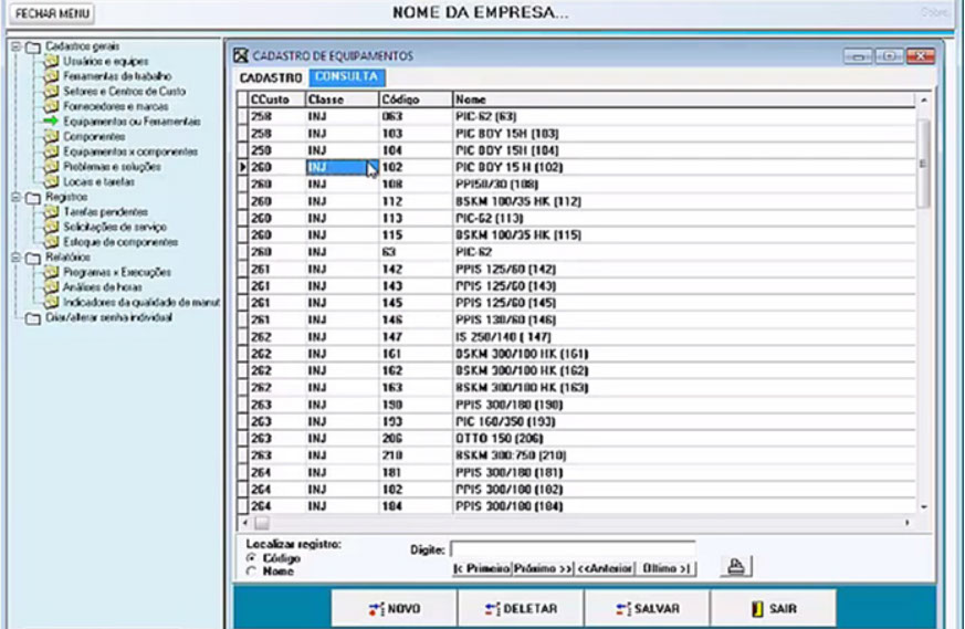  Registro de equipamentos ou ferramentais e seus componentes;