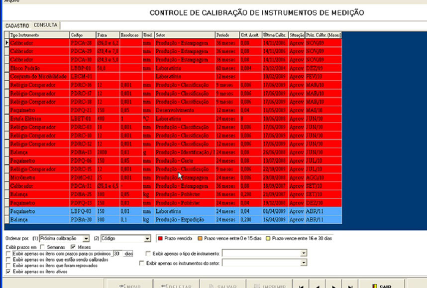  Controle do status de calibração de cada instrumento, indicando aqueles cujas calibrações estão em dia, próximas do vencimento ou vencidas;