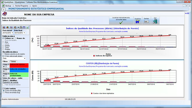  Geração instantânea de indicadores gráficos de barras, pizza, linha e Pareto;